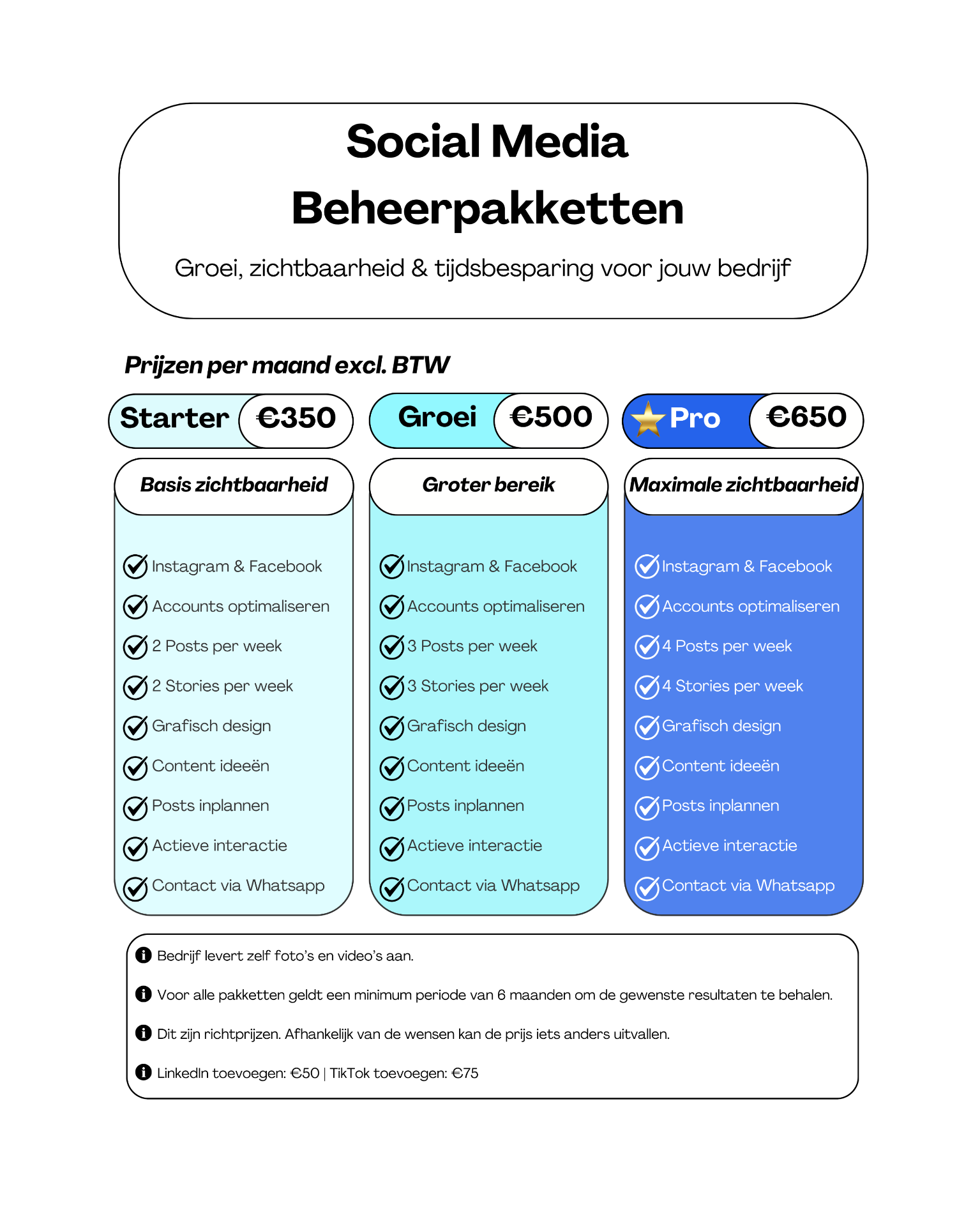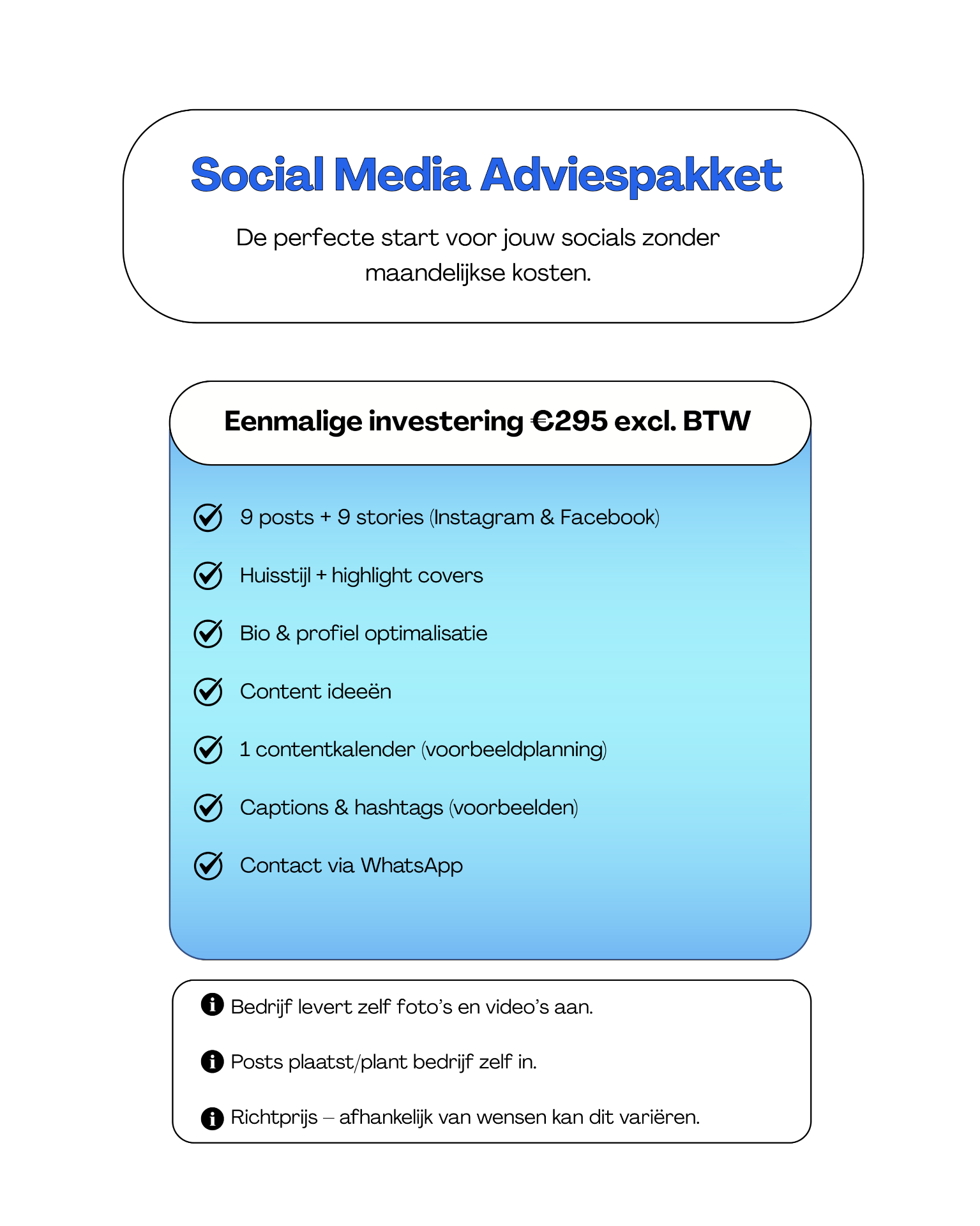 We houden contact via WhatsApp zodat ik je altijd op de hoogte kan houden. Daarnaast maak ik mooie content en schrijf ik unieke teksten. Ook worden je biografie, highlights en gegevens geoptimaliseerd en zorgen we voor de juiste hashtags.