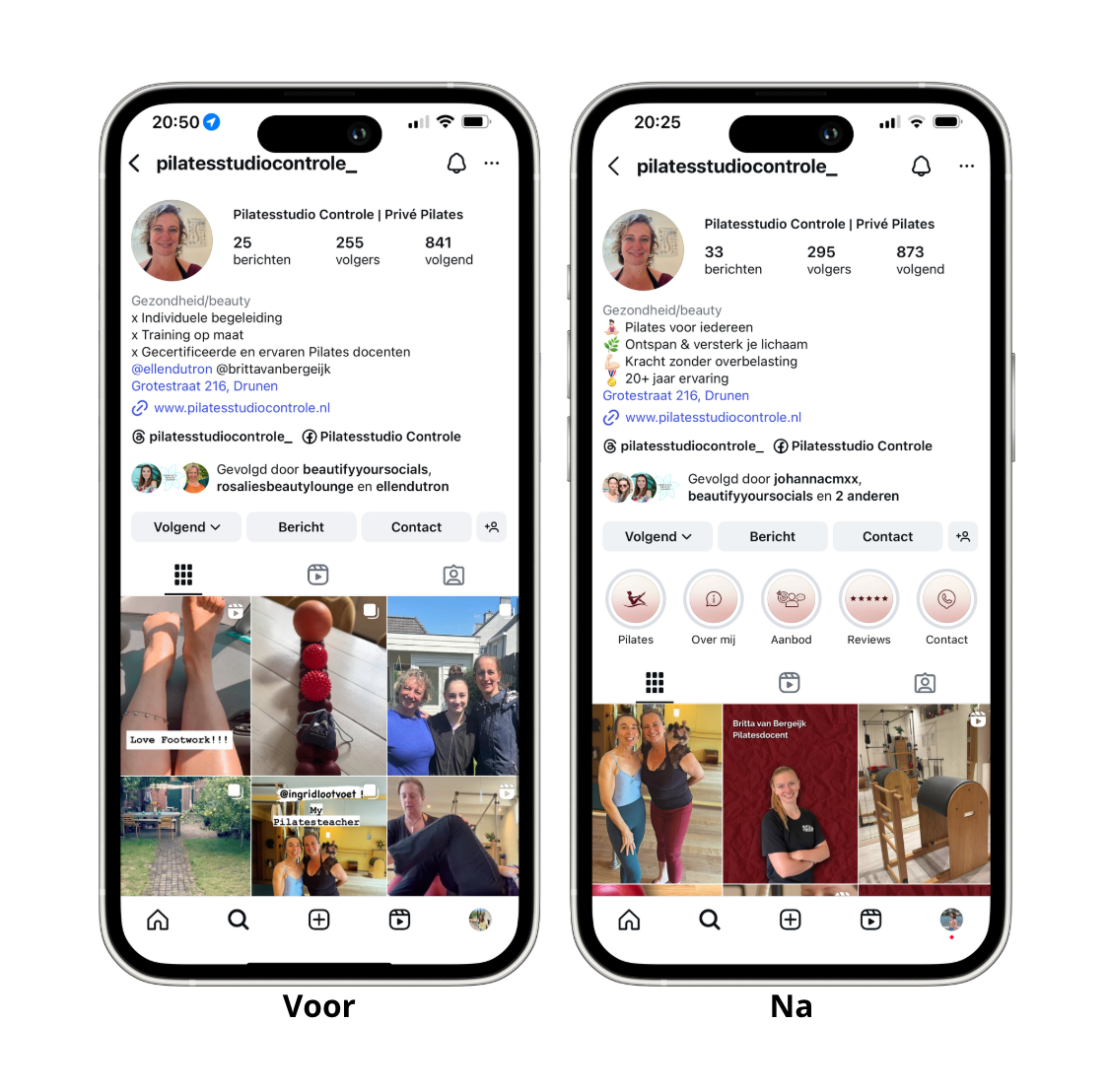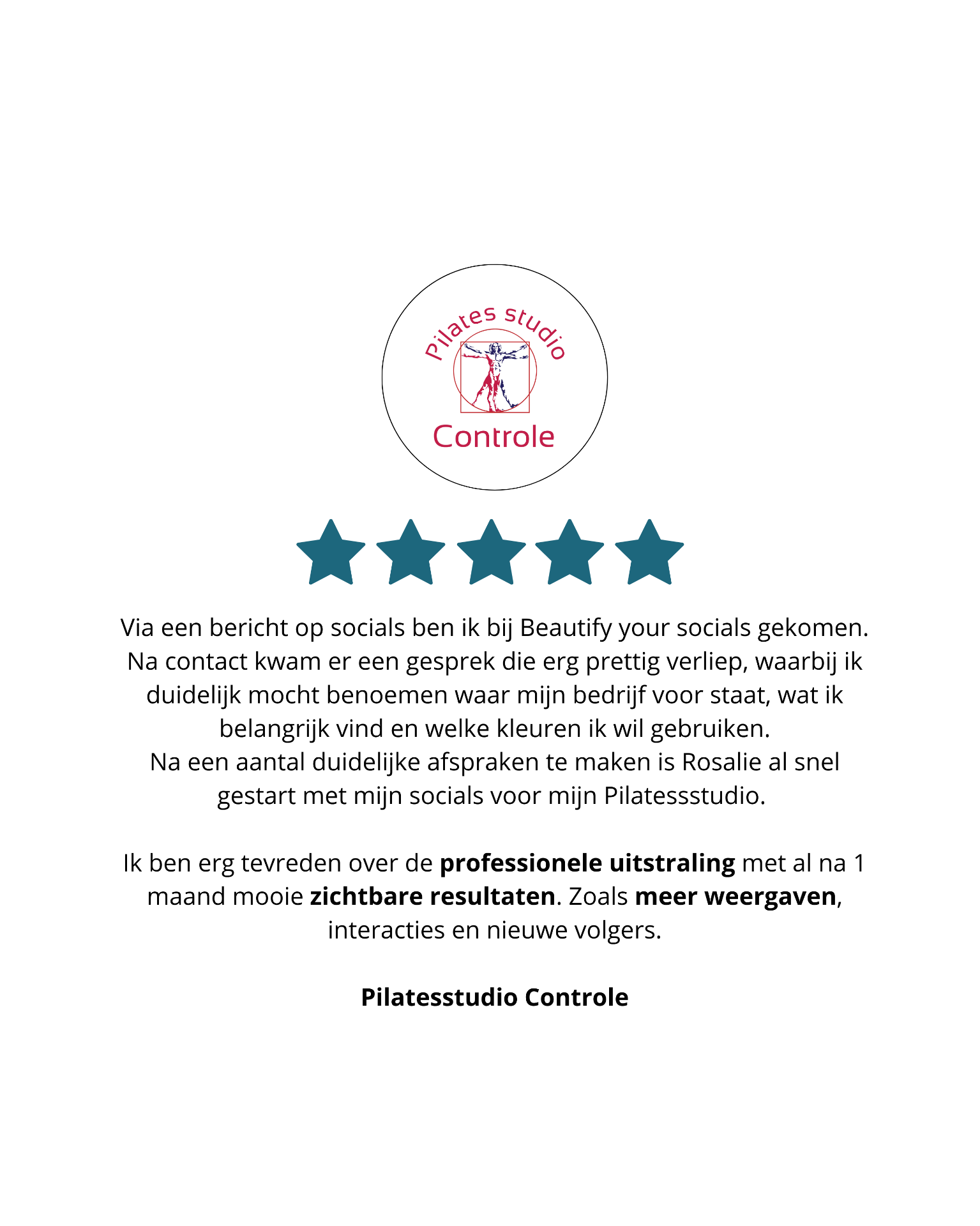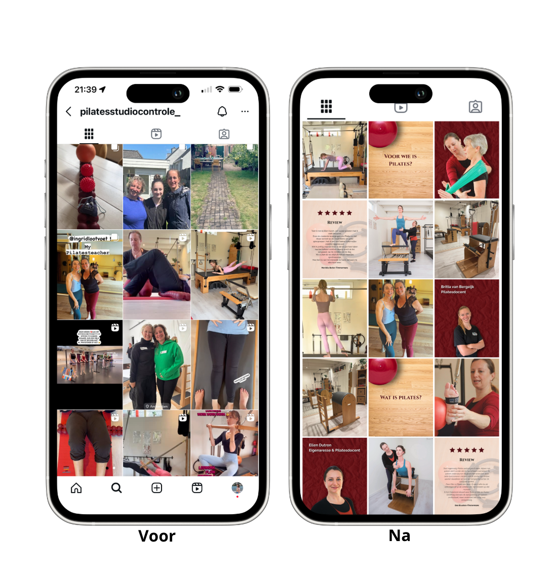 In slechts 1 maand kreeg Pilatesstudio Controle een complete Instagram make-over. Het profiel straalt nu professionaliteit en vertrouwen uit, waardoor nieuwe volgers en potentiële klanten sneller overtuigd raken. Door de juiste combinatie van strategische content en een herkenbare huisstijl groeit de lokale zichtbaarheid en wordt het makkelijker om nieuwe klanten aan te trekken.