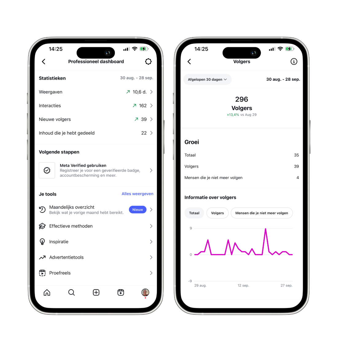 ▪️ Nieuwe volgers: +40 geïnteresseerde volgers met organisch social media beheer in de eerste maand (+13,4%) → naarmate het profiel steeds professioneler wordt, stijgen de volgers ook vaak steeds meer.