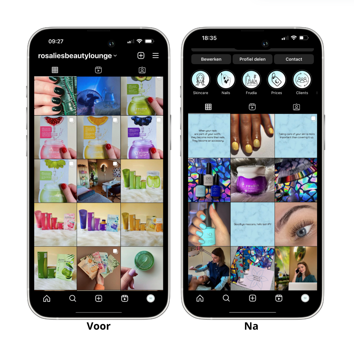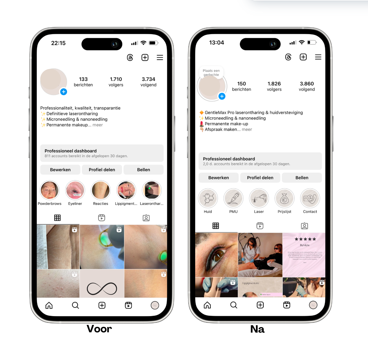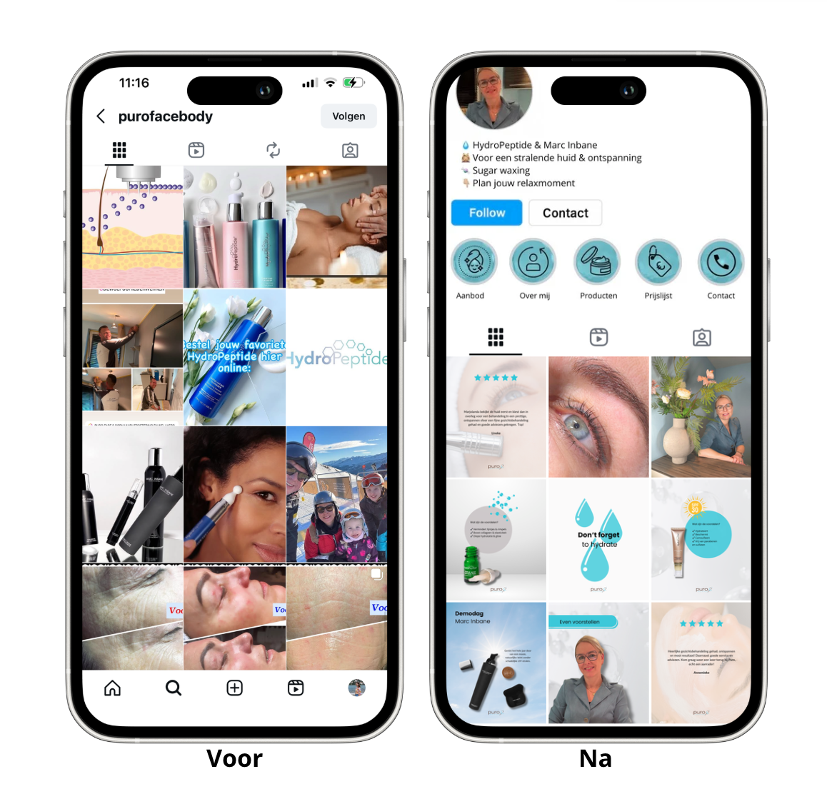 Voordat ik startte met de social media cursus had ik veel losse content. Het miste eenheid en professionaliteit. Door highlights, bio en content in een herkenbare stijl neer te zetten, heeft het account nu een uitstraling die aansluit bij de kwaliteit van de behandelingen en producten.