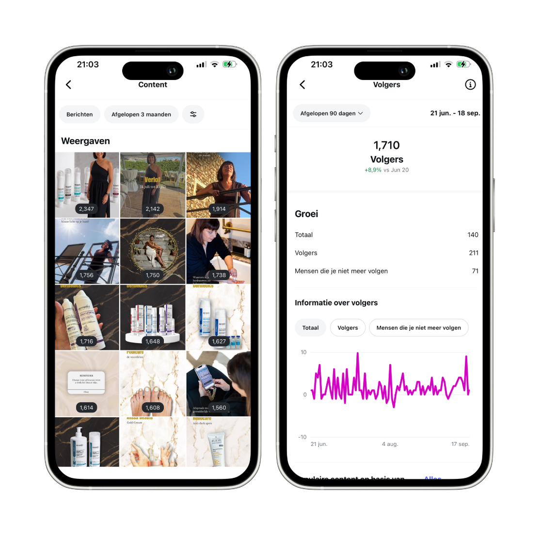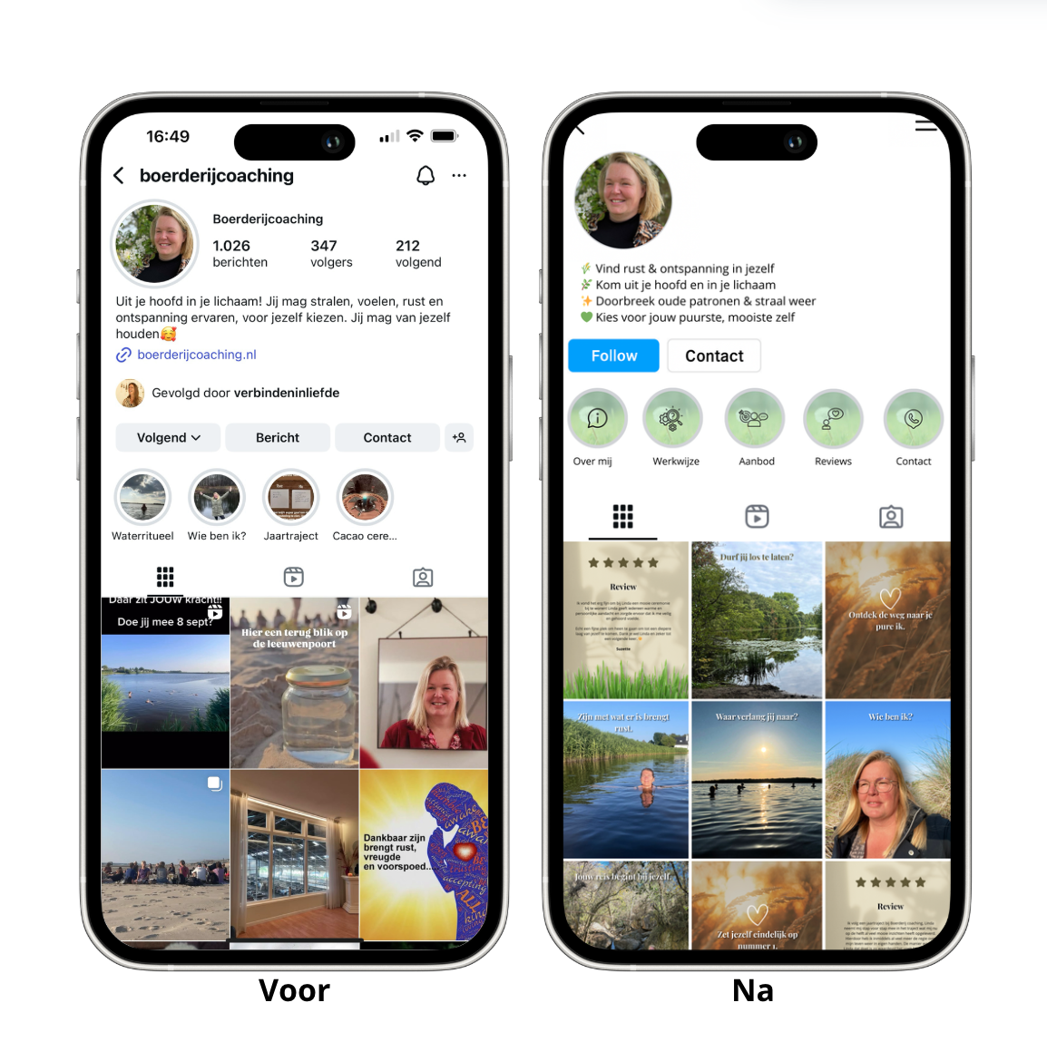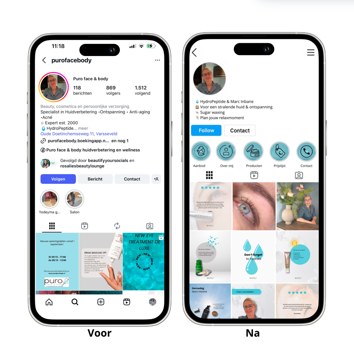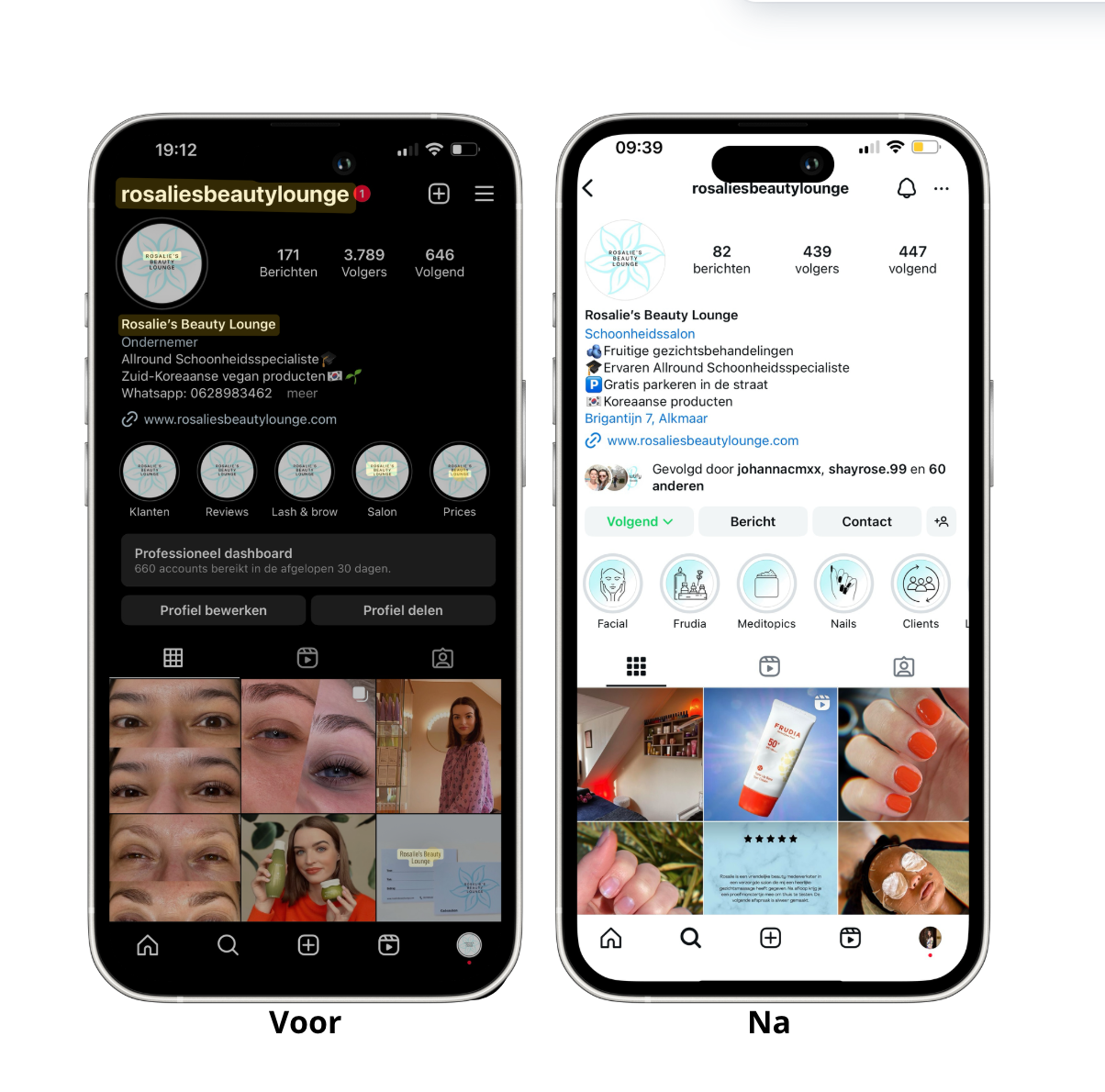 Voordat ik startte met de social media cursus had ik veel losse content. Het miste eenheid en professionaliteit. Door highlights, bio en content in een herkenbare stijl neer te zetten, heeft het account nu een uitstraling die aansluit bij de kwaliteit van de behandelingen en producten.
