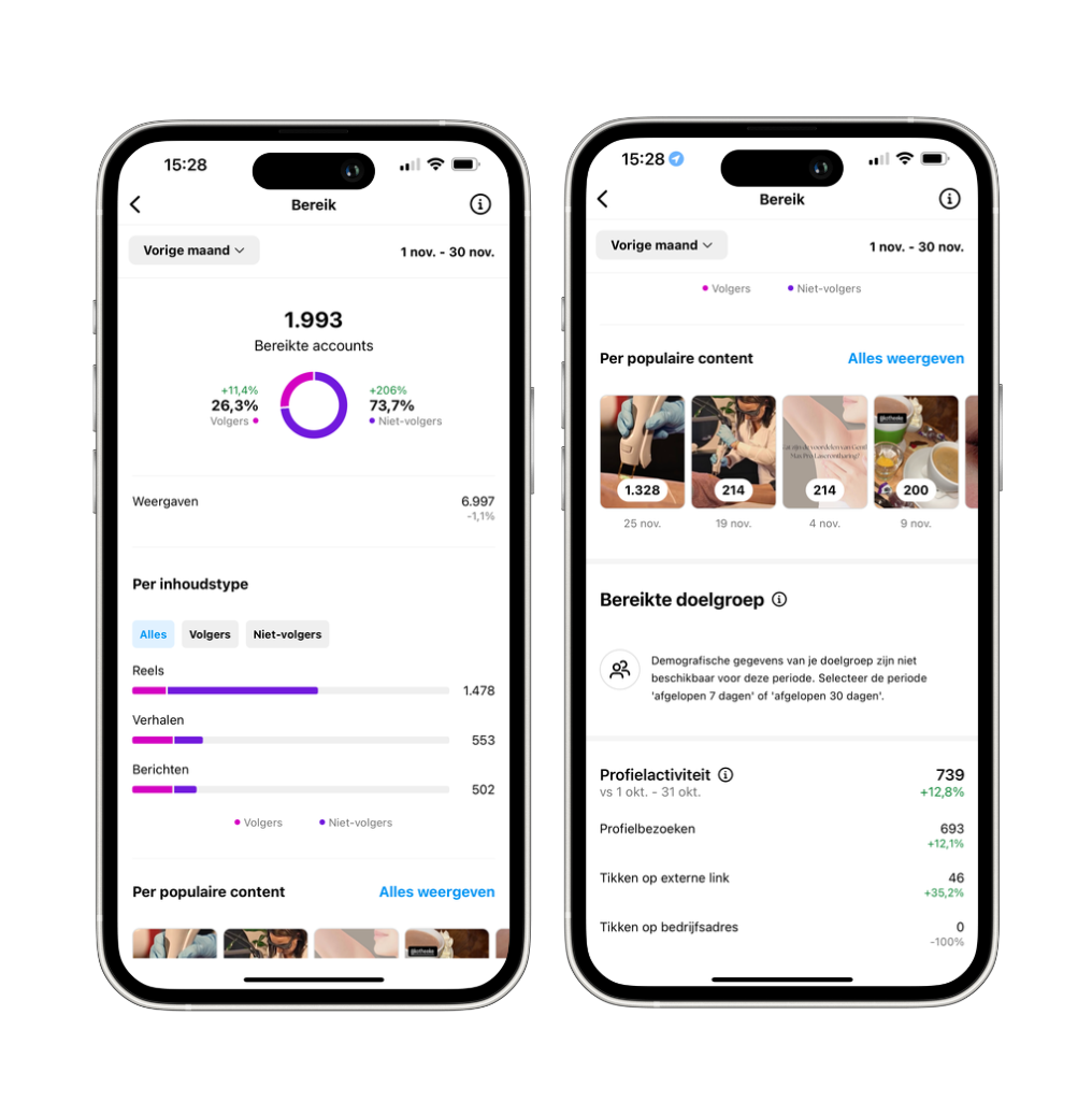 ▪️ Bereik in 30 dagen: 1.993 accounts (waarvan 73,7% niet-volgers → extra potentiële klanten).
