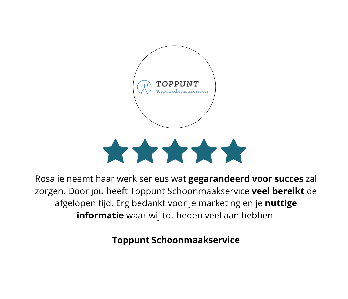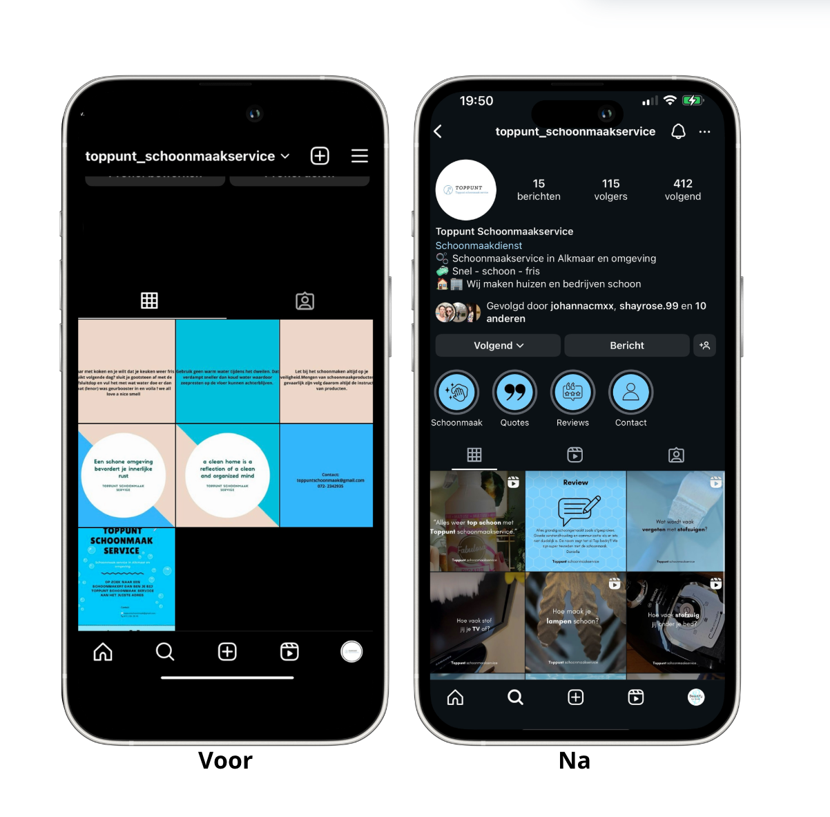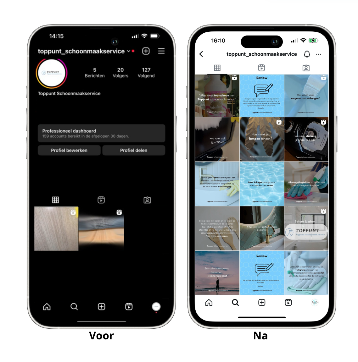 Toppunt Schoonmaakservice begon bijna vanaf nul. Door een sterke huisstijl en klantgerichte content te creëren, staat er nu een Instagram-profiel dat vertrouwen uitstraalt en nieuwe klanten heeft aangetrokken.