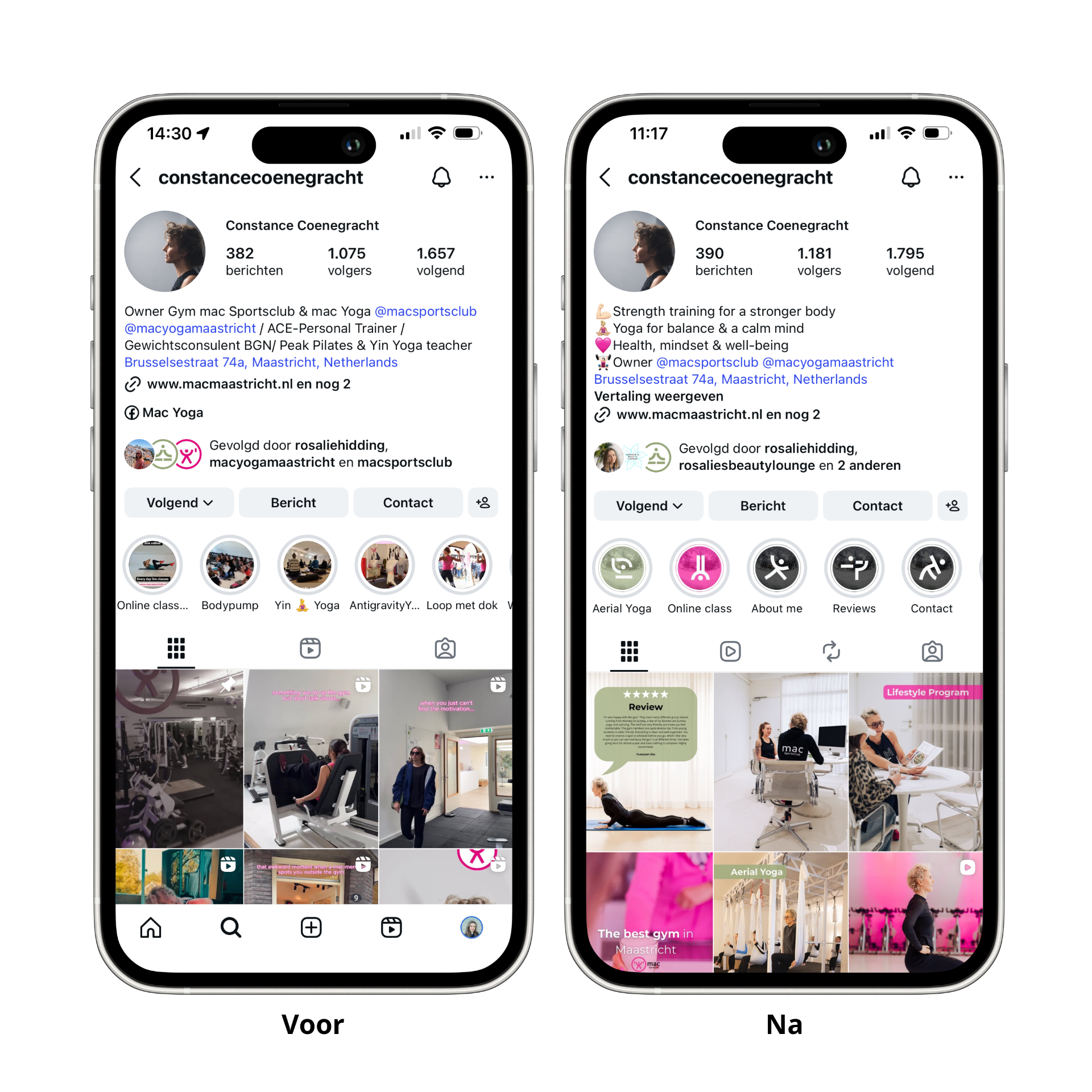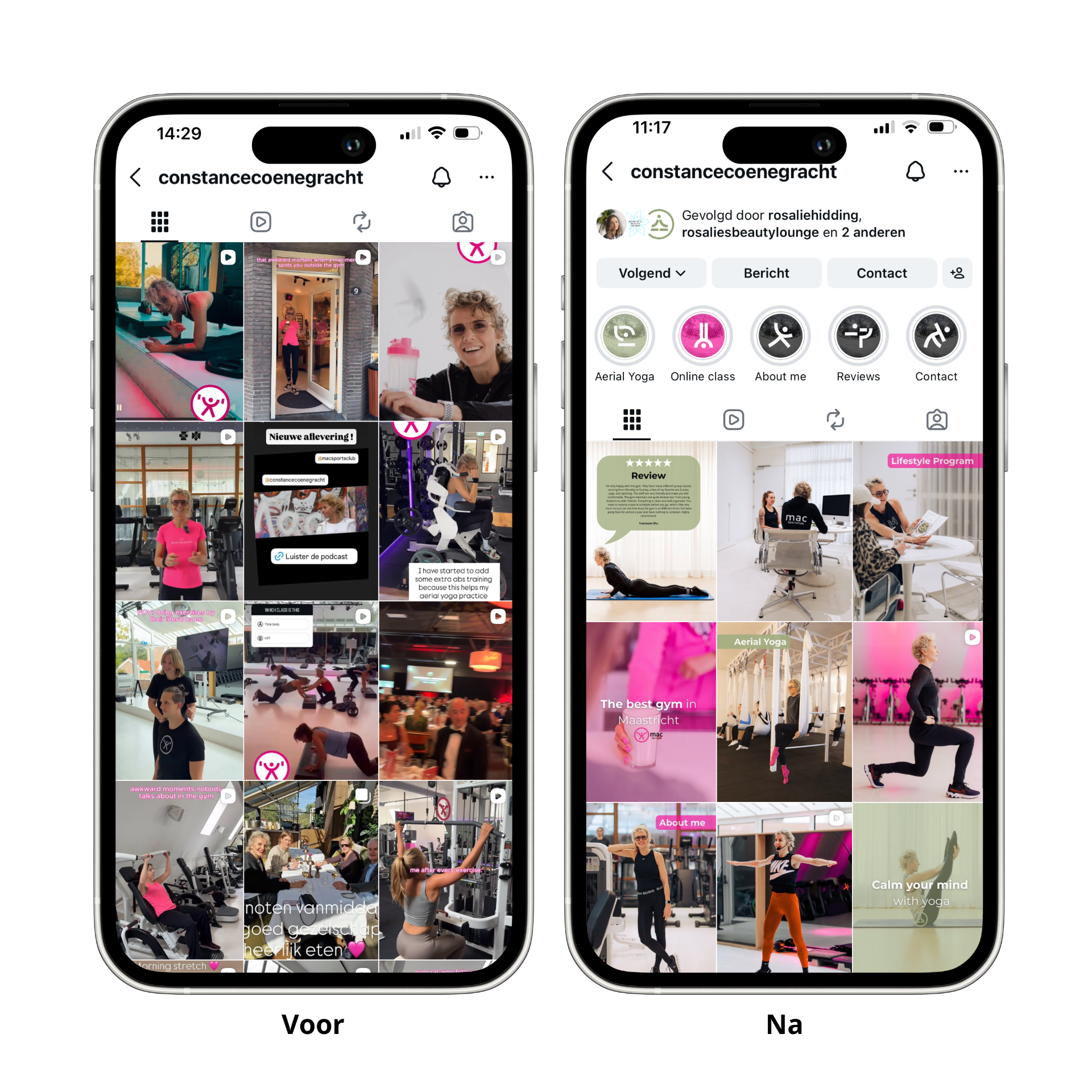 Voordat ik startte met de social media cursus had ik veel losse content. Het miste eenheid en professionaliteit. Door highlights, bio en content in een herkenbare stijl neer te zetten, heeft het account nu een uitstraling die aansluit bij de kwaliteit van de behandelingen en producten.